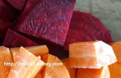 우선 사과를 깨끗하게 씻은 후 씨를 제거한 후 껍질째 썰어둡니다. 비트와 당근은 껍질을 제거하고 깍둑 설어 준비합니다. 채소를 생으로 먹으면 배탈이 나거나 속이 불편한 분들이라면 비트, 당근을 10분 정도 쪄서 abc 주스를 만들면 좋습니다.